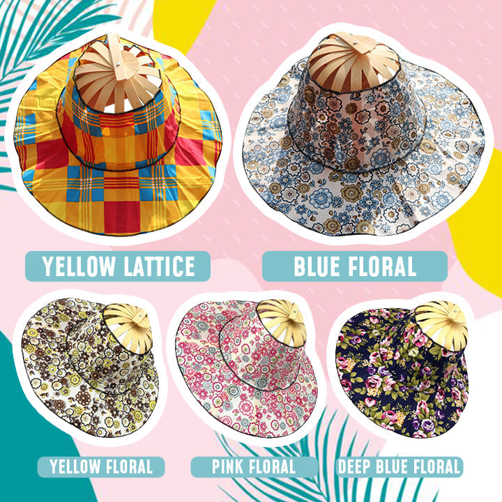 Bamboo Foldable Hand Fan Sun Hat is a floral sun hat that turns to a foldable hand fan instantly for cooling off summer heat. Packable and durable to use!