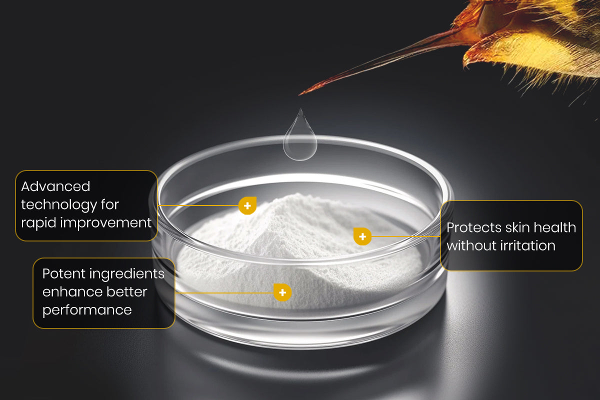 Through multiple experiments validated by modern medicine, bee venom (BV) as a defensive venom has been shown to growth performance. Through collaborative efforts in several medical laboratories in the United States, a process of purifying, concentrating, and removing harmful substances from natural native bee venom has been developed. This has led to the creation of Sweet Bee Venom (sBV), a groundbreaking new active ingredient that is seven times more effective than bee venom (BV) without any irritating components. This innovation addresses the traditional drawbacks of bee venom therapy, such as skin discomfort and potential sensitization.