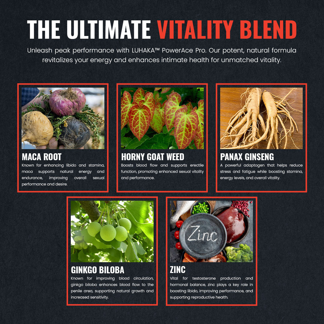 Luhaka™ IgniteForce is designed to enhance male performance and energy by combining a potent blend of natural ingredients known for their ability to boost stamina, support testosterone levels, and improve blood circulation. Maca Root and Epimedium (Horny Goat Weed) work synergistically to enhance sexual performance by increasing blood flow to key areas, promoting harder, longer-lasting erections. Ginseng further elevates stamina and vitality, reducing fatigue and enabling sustained performance during intimate moments. By supporting testosterone production, Luhaka™ IgniteForce helps men maintain their energy, vitality, and confidence.